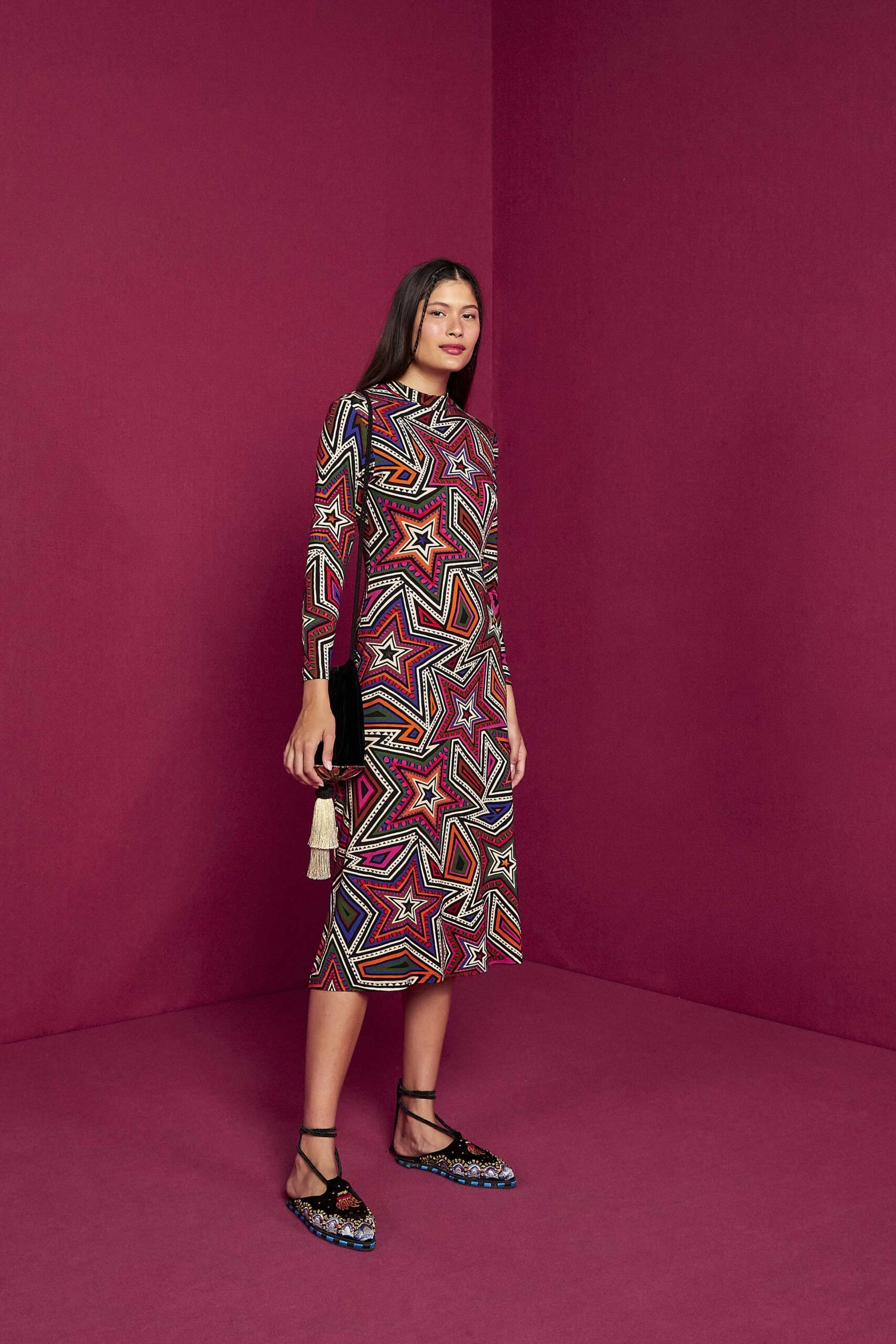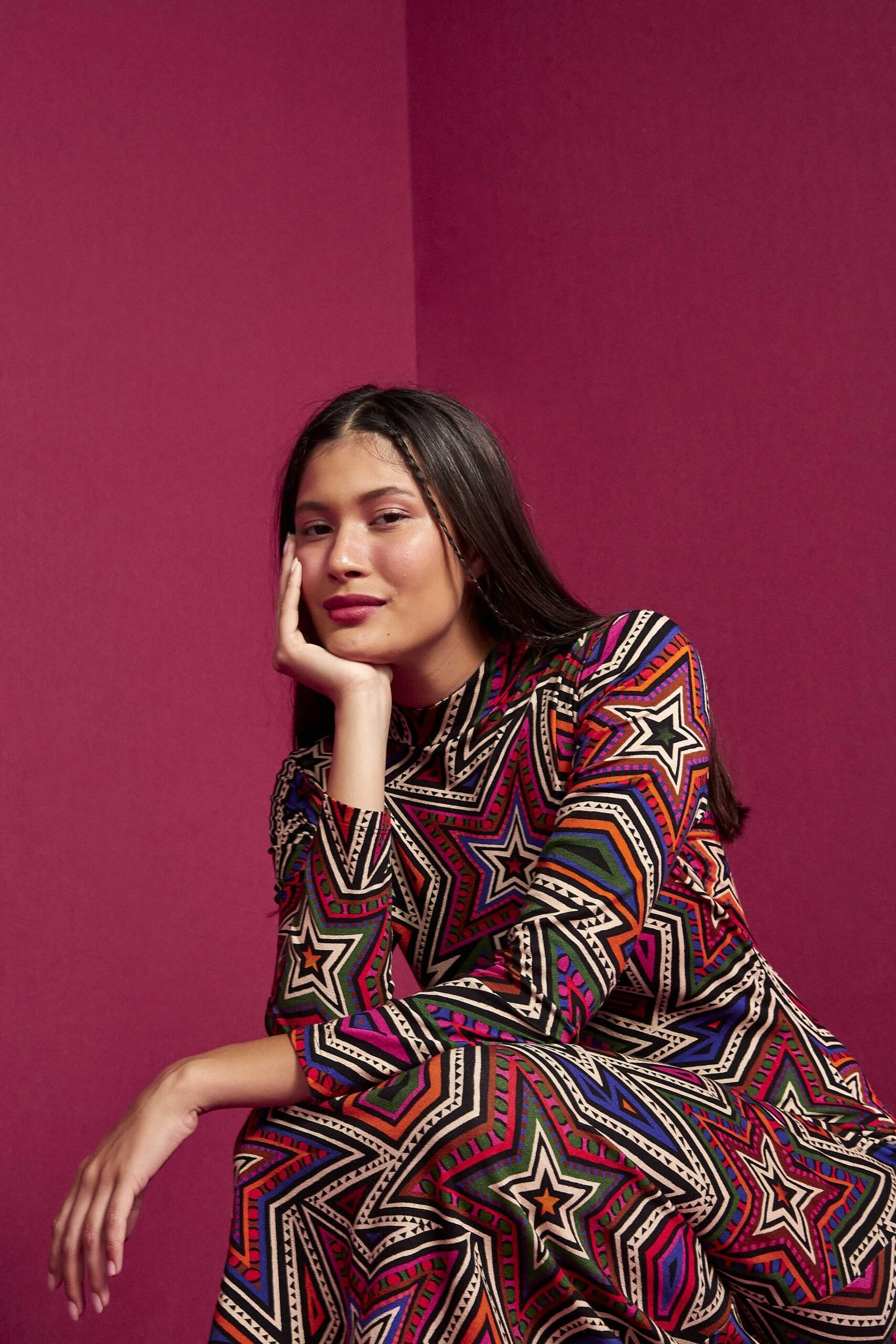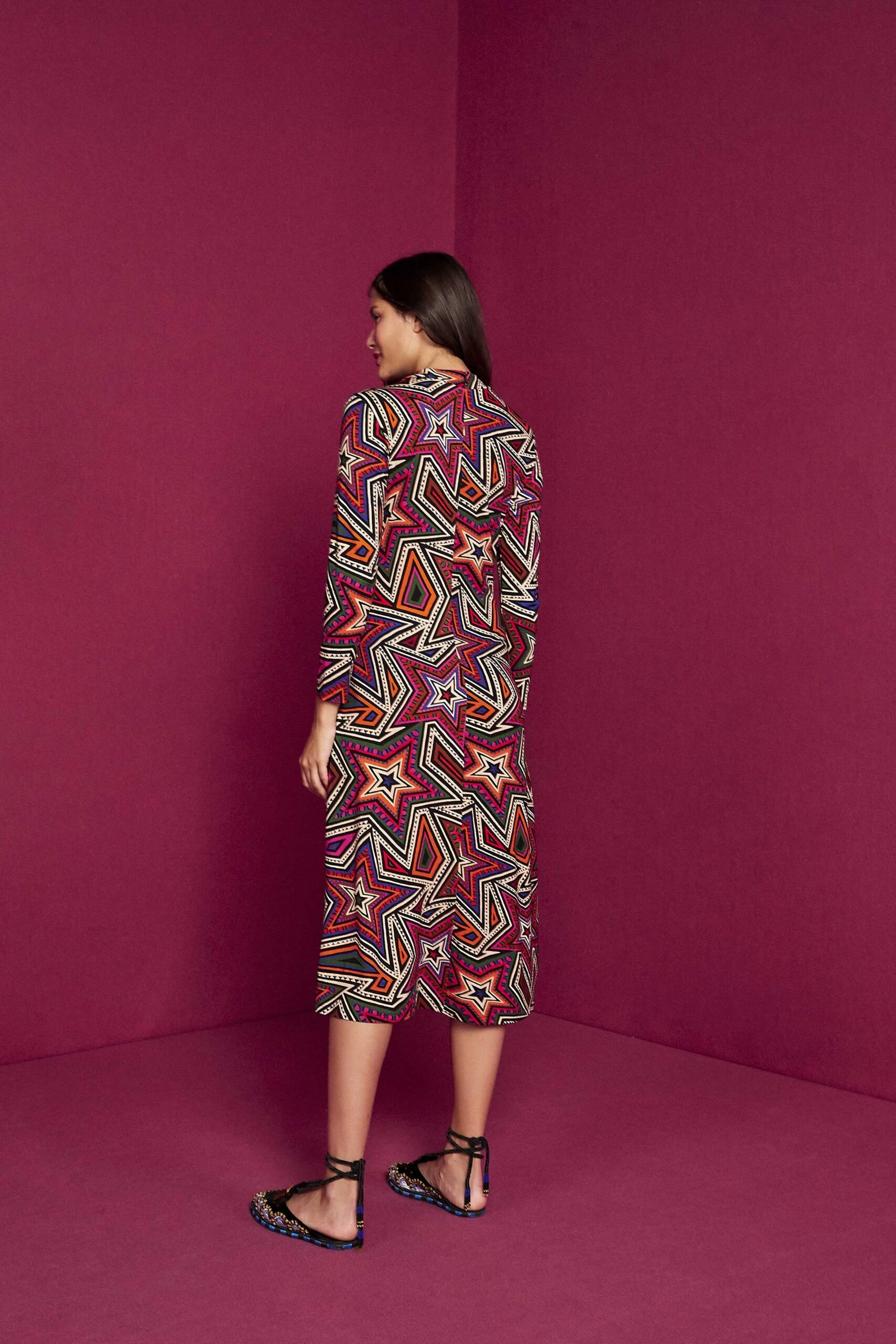 Colorful graphics for Fall? So groundbreaking with the Mystic Trip Lenzing™Ecovero™Jersey Dress! It features a body-embracing silhouette with long sleeves and a midi length to keep showing some legs and bold shoes. If it gets colder, invite your warm cardigans and puffer jackets to bring the sun out even on the coldest days!