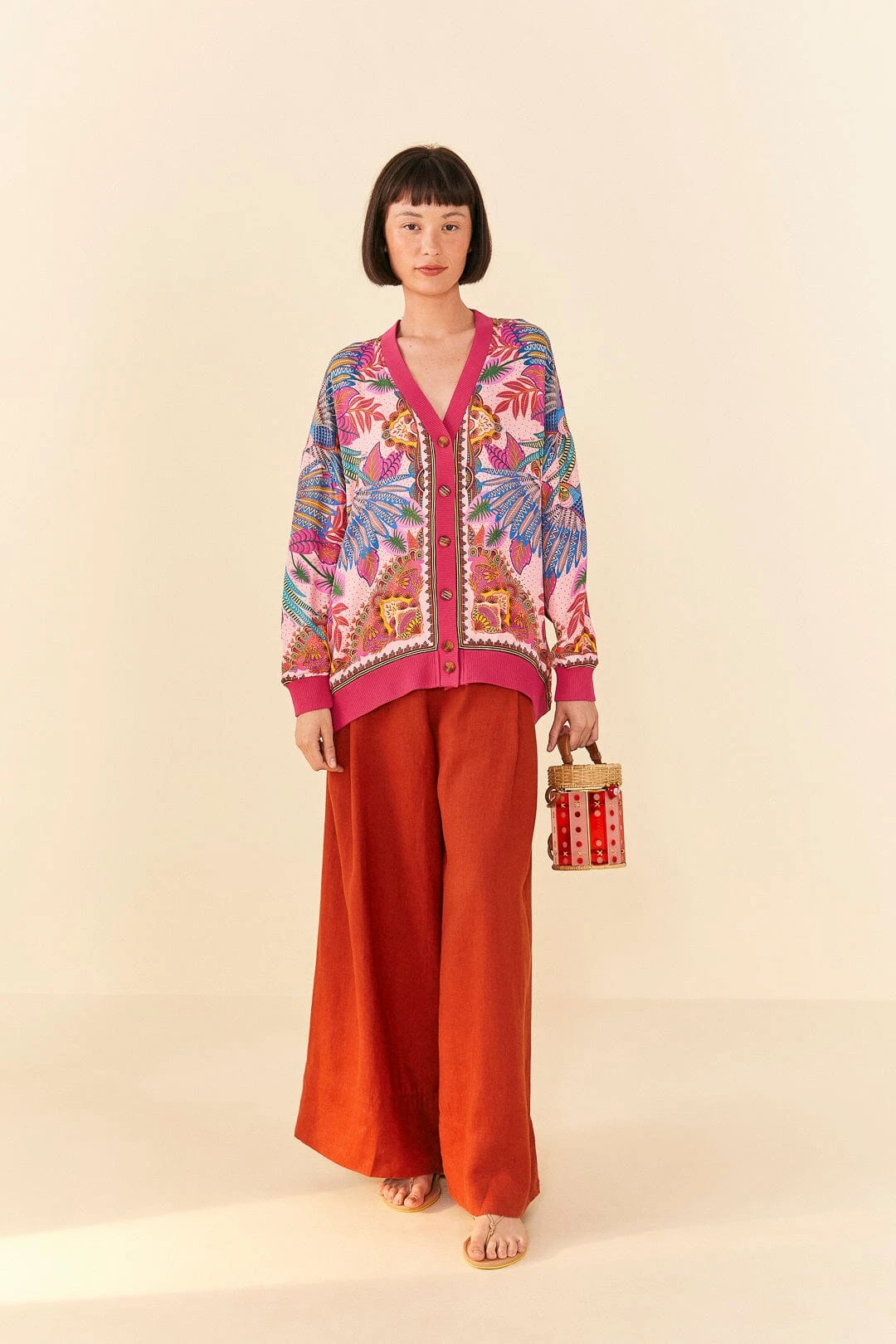 Flying higher is what happens when you choose the Pink Macaw Scarf Lenzing™ Ecovero™ Viscose Cardigan to spread joy everywhere! It mixes the cozy fit of a layer with the elevated fabric, besides bringing versatile buttons to style it open or closed. This new print is a bold addition to your timeless wardrobe, and all your looks (printed or not!) will thank you for this cool piece.