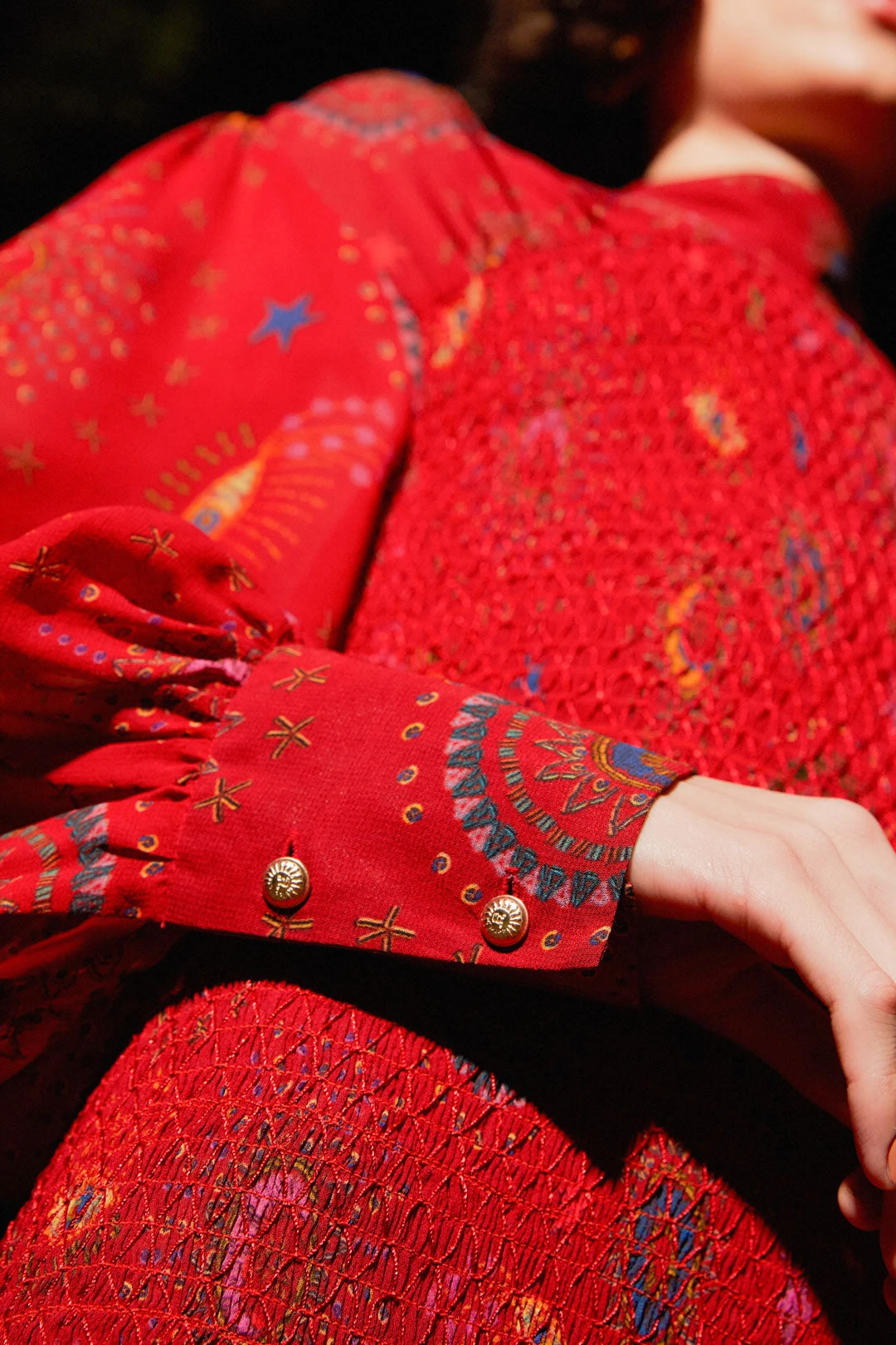 A timeless fave to elevate any special occasion. The Red Mystic Night Midi Dress brings a classic silhouette that embraces you and follows your bold moves at the same time. It has a smocked bodice, long sleeves to deal with the breeze, and the print is an invite to get the best of all celebrations coming your way. So invite your fave FARM Rio Shoes and go have fun all around!